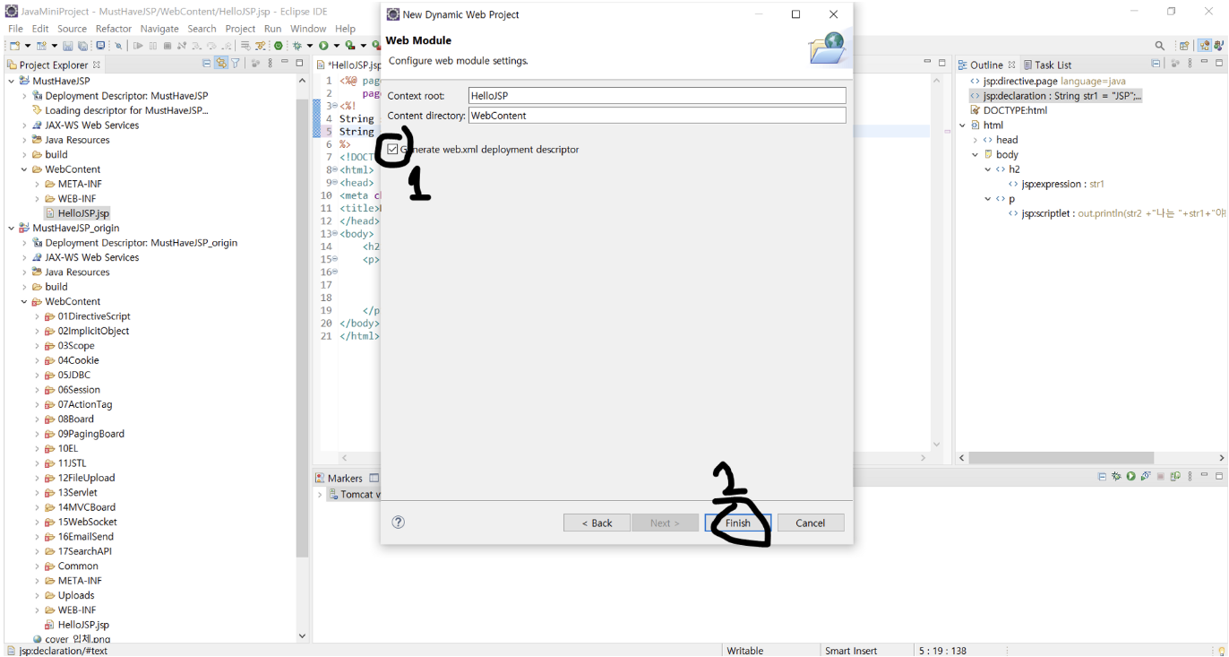 • Context directory: JSP 파일을 생성할 폴더 이름, 배포 서술자(deployment descriptor) web.xml 파일 생성 여부