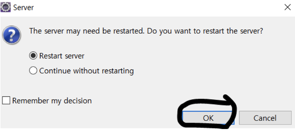 (7) 서버가 이미 실행 중이라면 재시작 여부를 묻는데, 그대로 [OK] 클릭