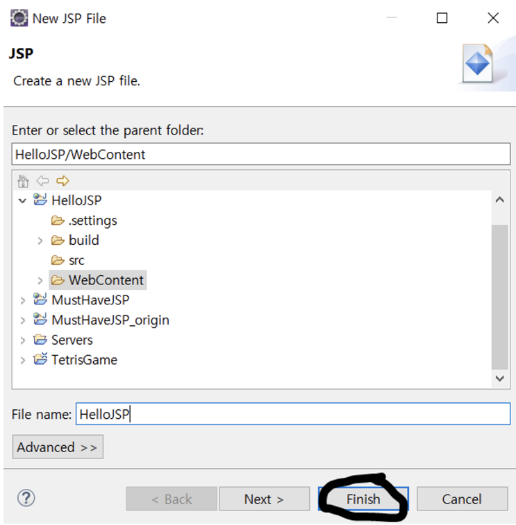 (2) 파일명을 “HelloJSP”로 입력하고 [Finish] 선택 (.jsp 확장자는 자동으로 부여됨)
