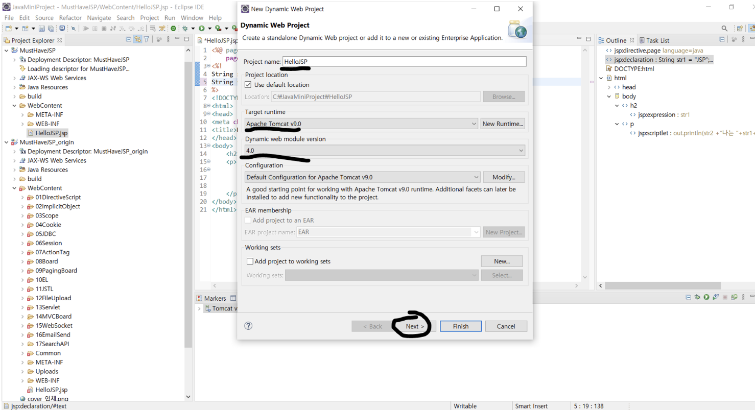 → Project name: HelloJSP, Target runtime: Apache Tomcat v9.0,
