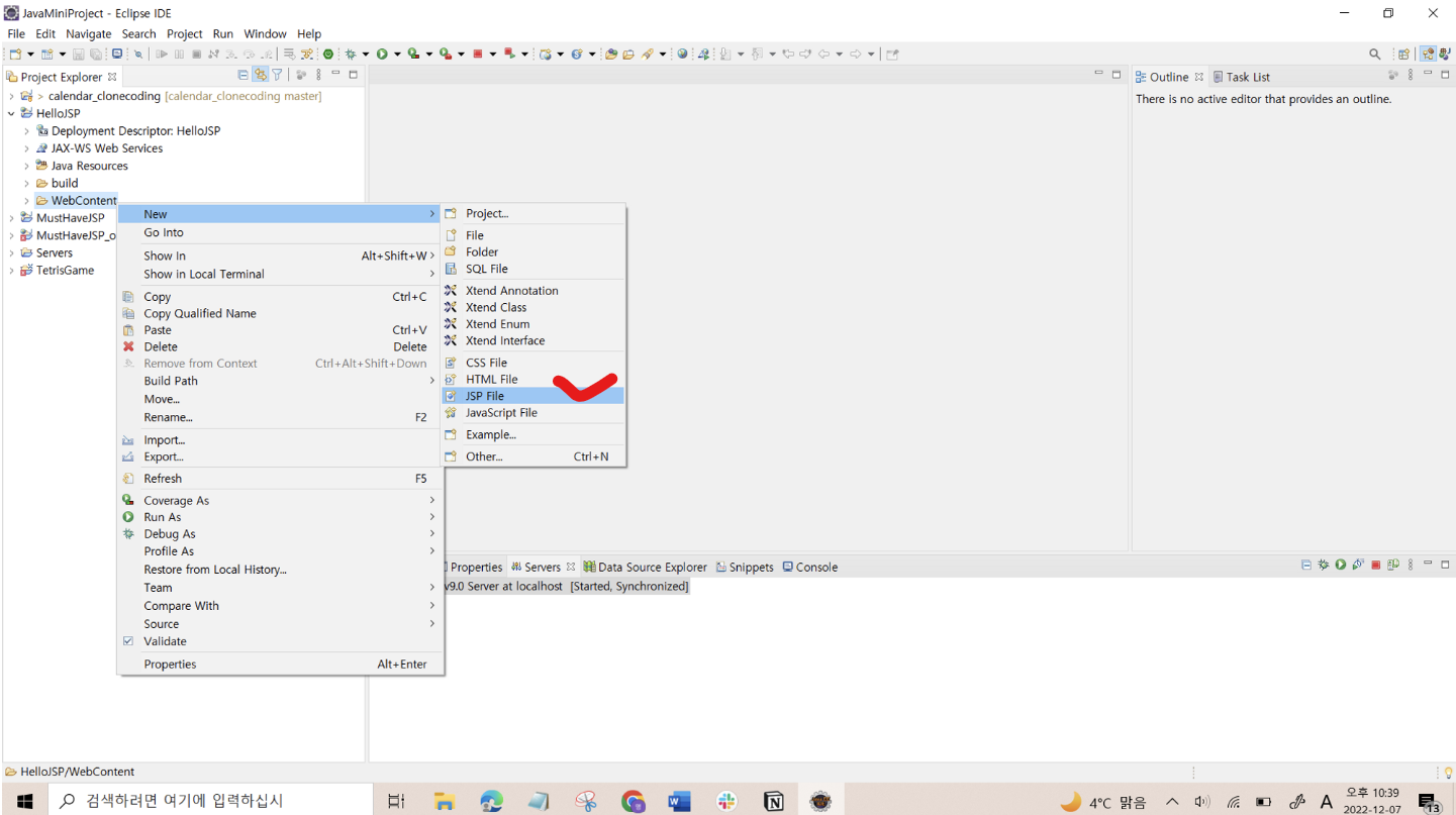 (1) HelloJSP 프로젝트의 WebContent 디렉토리에서 마우스 우클릭 → [New] → [JSP File] 선택