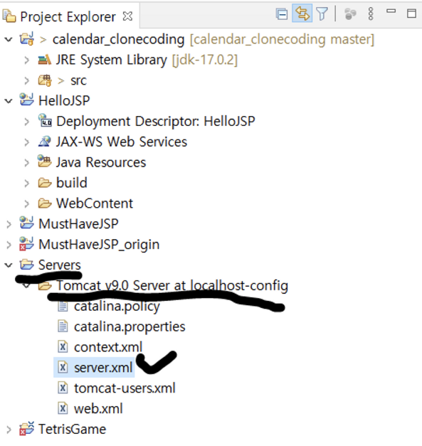 1) [Project Explorer] → [Severs] → [Tomcat v9.0 Server at localhost-config] → [sever.xml] 파일 더블클릭