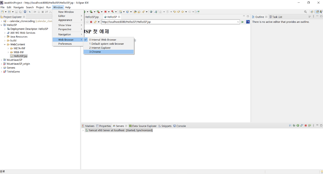 - 이클립스의 내장 브라우저는 결과를 실제 웹 브라우저와 다르게 보여주는 경우도 있음