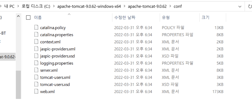 1) 노트북의 윈도우 탐색기 → 톰캣 설치 경로의 conf 폴더로 이동