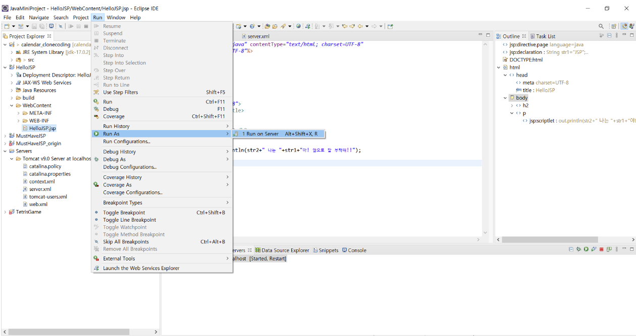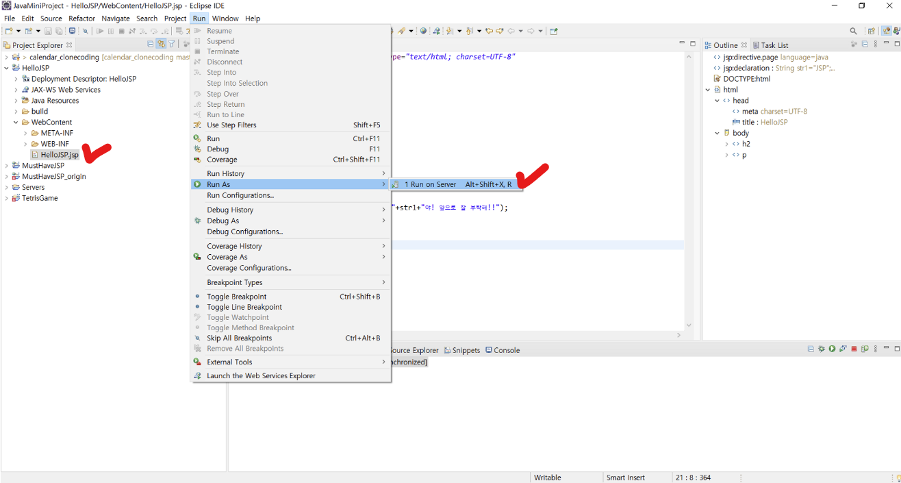 4) 편집창에서 HelloJSP.jsp 파일 선택 후, [Run] -> [Run as] -> [Run on Server]로 실행