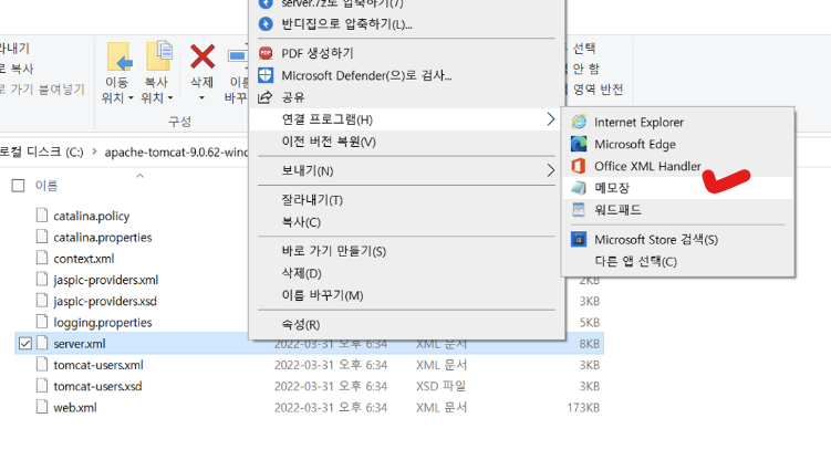 2) server.xml 파일 마우스 우클릭 → [연결 프로그램] → [메모장]