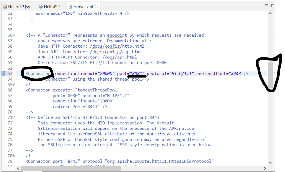 3) Connector 엘리먼트를 찾아 port 속성의 값을 8081로 수정 후 Ctrl+S를 눌러 sever.xml 저장