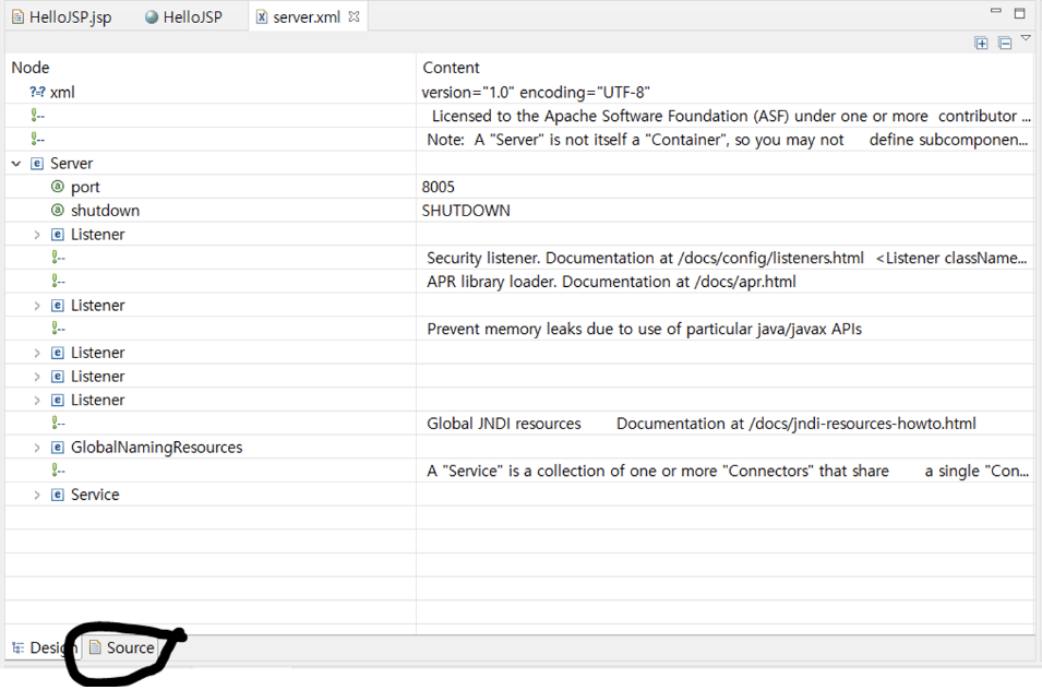2) sever.xml의 편집창 아래쪽의 [Source] 탭 클릭