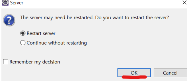 -> [Sever] 창이 뜨면 [Restart server]가 선택되어 있는지 확인하고 [OK] 클릭