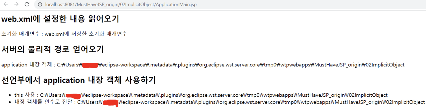 - 선언부에 정의한 메소드 2-”/02ImplicitObject”의 물리적 경로 반환 [이때 필요한 서블릿 컨텍스트를 매개변수로 받음)