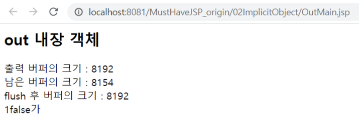 - OutMain.jsp 실행 결과 → print()를 사용하면서 버퍼가 채워지다가, flush()로 모두 출력된 후 크기가 복원된 것을 알 수 있음