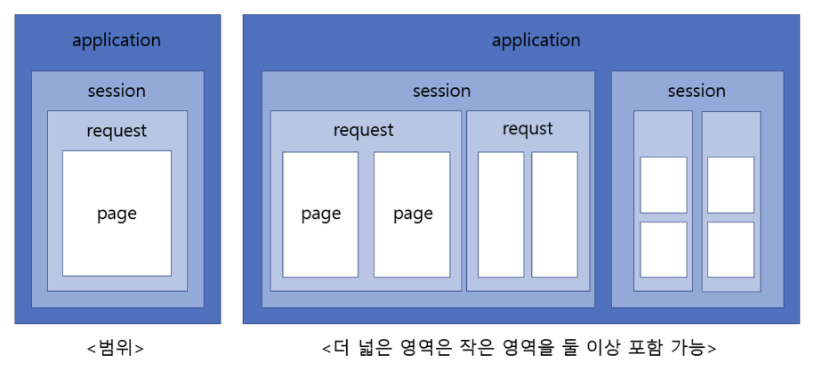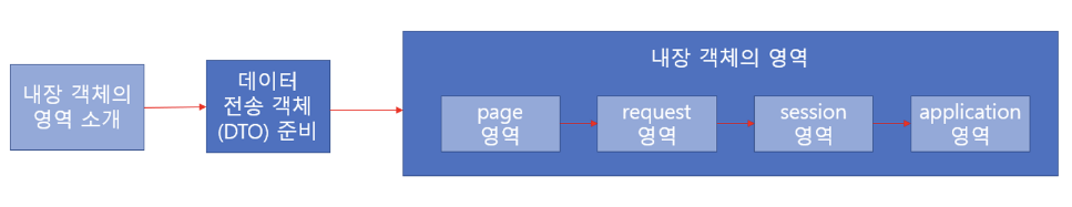- 내장 객체 중 4개는 ‘영역’ 개념을 갖고 있음 - 데이터를 저장하고 공유할 수 있는데, 각 영역에 저장된 데이터는 공유 범위가 서로 다름 → page 영역, request 영역, session 영역, application 영역이 있음
