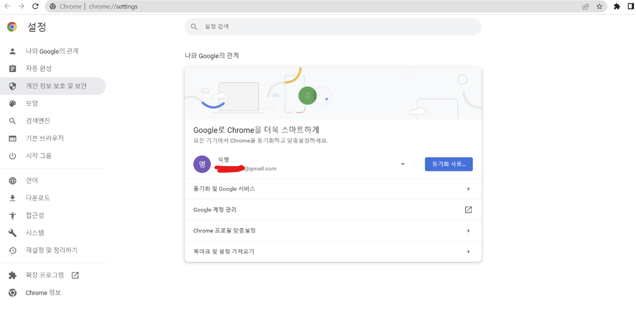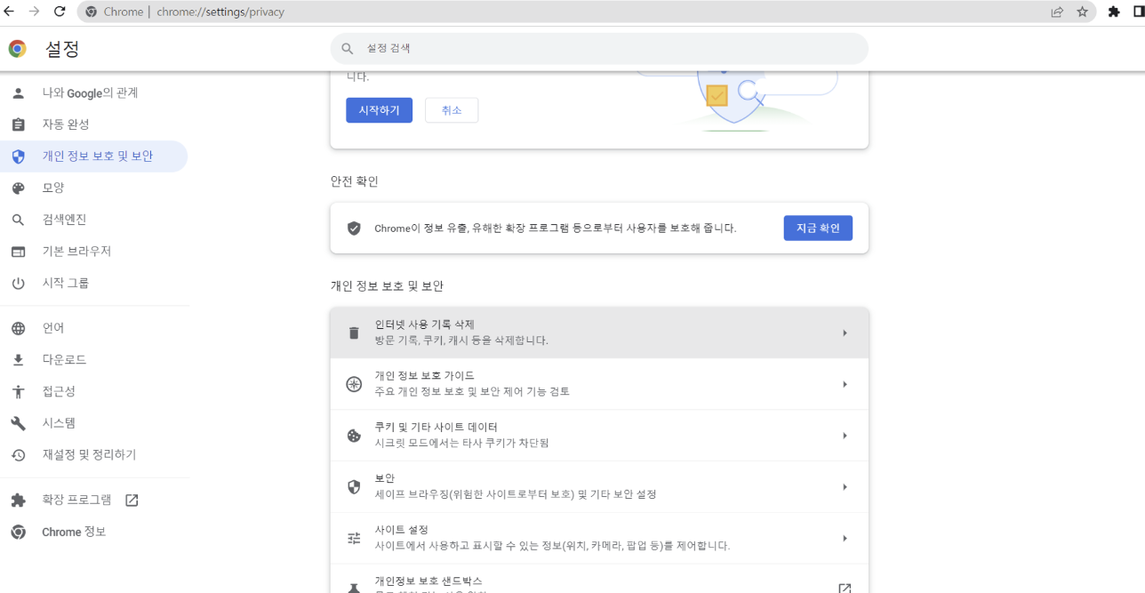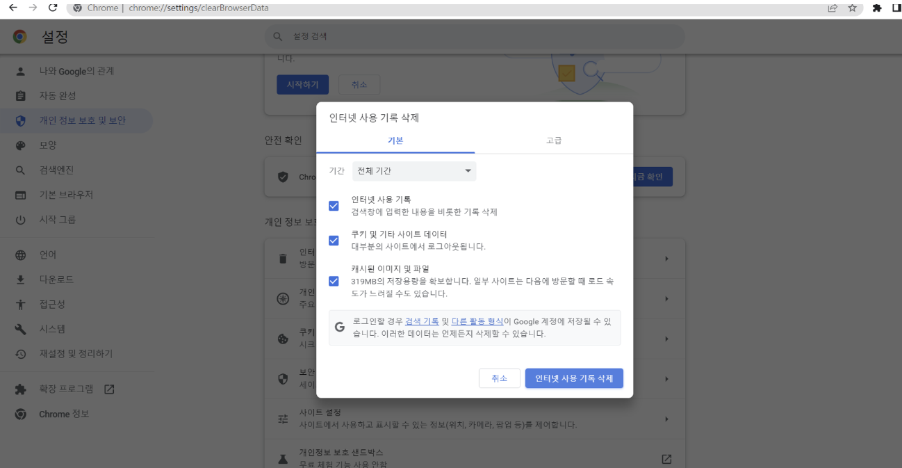 - 크롬 브라우저 → [설정] → [개인정보 및 보안-인터넷 사용 기록 삭제] → 기간은 ‘지난 1시간’, [쿠키 및 기타 사이트 데이터] 체크박스 ‘체크