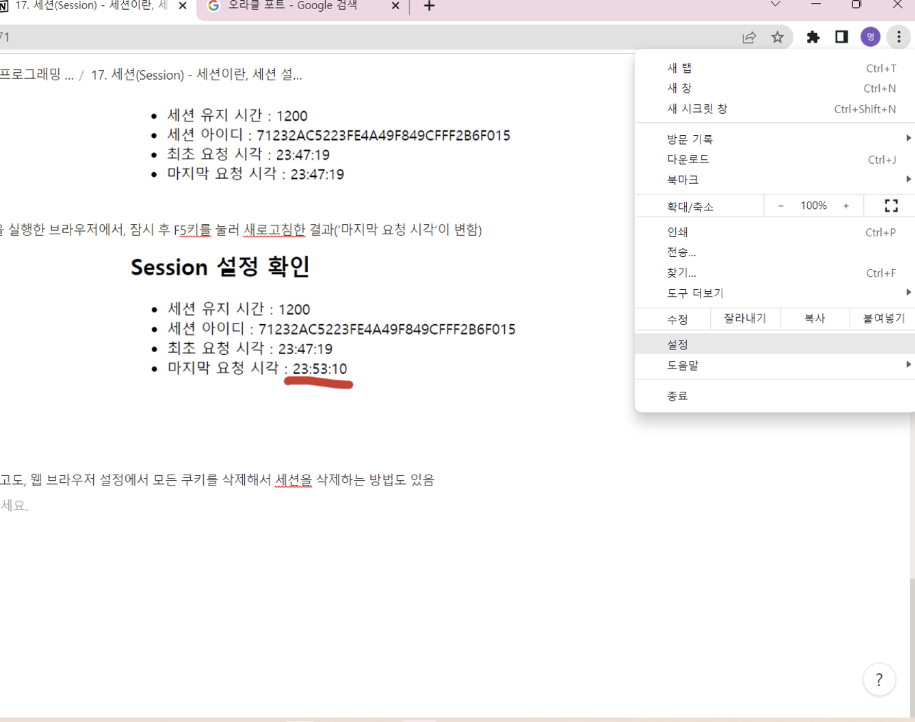 - 현재 세션 설정값 확인3 - 2.에서 구한 세션의 최초 요청 시각과 마지막 요청 시각을 출력