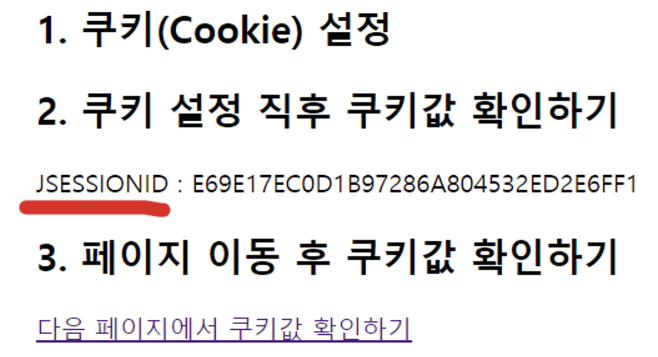 - 앞에서 만들었던 CookieMain.jsp 파일을 실행하고, ‘쿠키 설정 직후 쿠키값 확인하기’ 아래를 확인하면, 우리가 생성한 적이 없는 쿠키명인 ‘JSESSIONID’가 출력됨