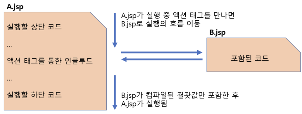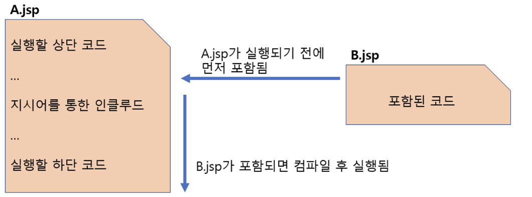 | 포함 방식 | 페이지 자체를 현재 페이지에 포함시킴 (이후 컴파일 → 실행) | ‘실행의 흐름’을 포함시킬 페이지로 이동한 후, 실행한 결과를 현재 페이지에 포함시킴 |