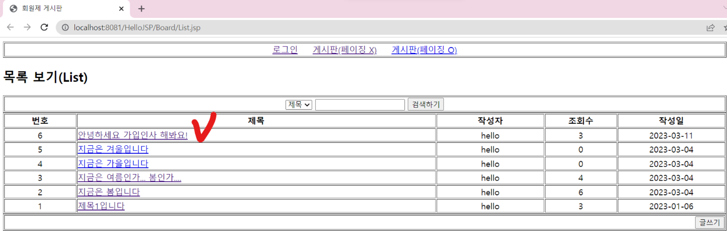 3) [게시판(페이징 X)] 클릭 후, 삭제하려는 게시글의 ‘제목’을 클릭해 상세 보기 페이지로 이동