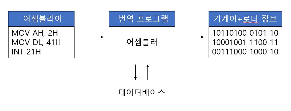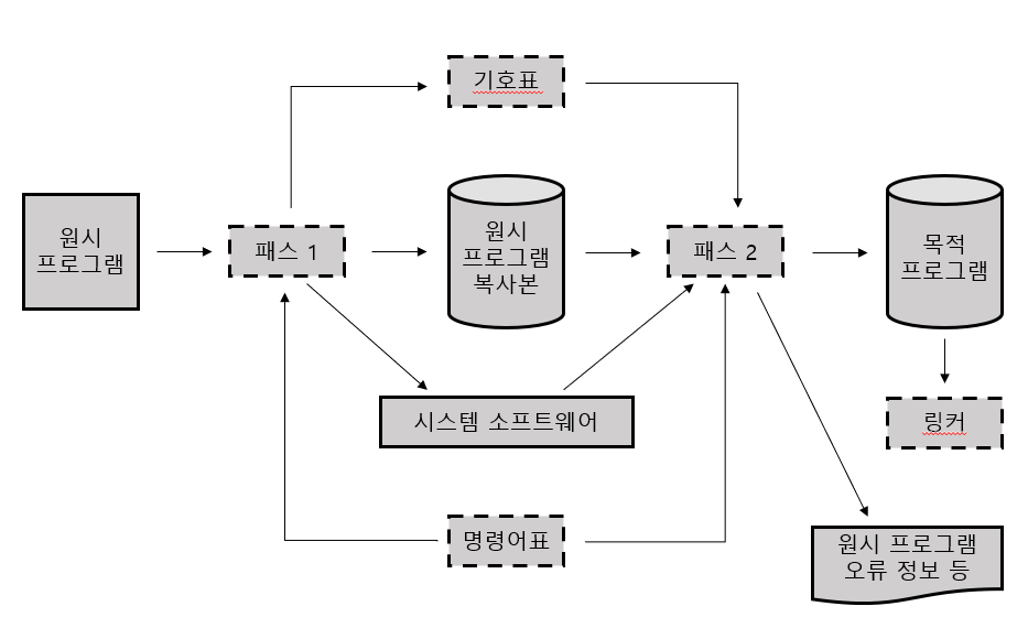 - 어셈블리어로 작성된 소스 프로그램을 기계어(0과 1로 구성된 언어)로 번역(변형)하고 로더(실행 가능한 파일로 만드는 프로그램)에 필요한 정보를 생성