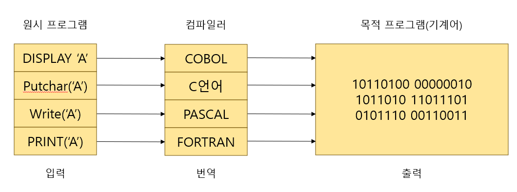 - 고급 언어로 작성된 프로그램을 기계(컴퓨터)에 적합한 프로그램으로 번역해주는 프로그램