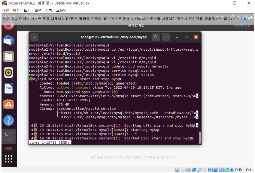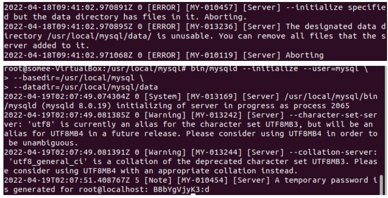 - rm -rf /usr/local/mysql/data/* 이후 ‘임시 비밀번호 발급받기’부분을 다시 입력해서 해결!