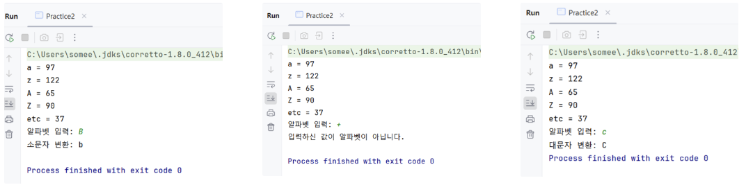 - 아스키 코드 알파벳에 대해서, 사용자가 입력한 알파벳의 대소문자를 변경하는 프로그램 작성