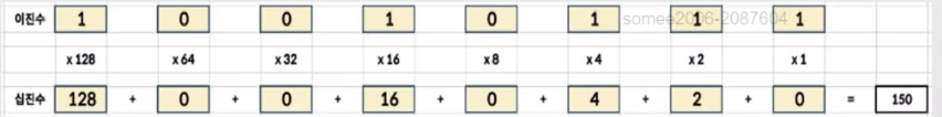 - 10010110이라는 2진법 수는 10진법 150으로 변환 가능