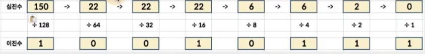 - 150이라는 10진법 수는 2진법으로 변환 가능