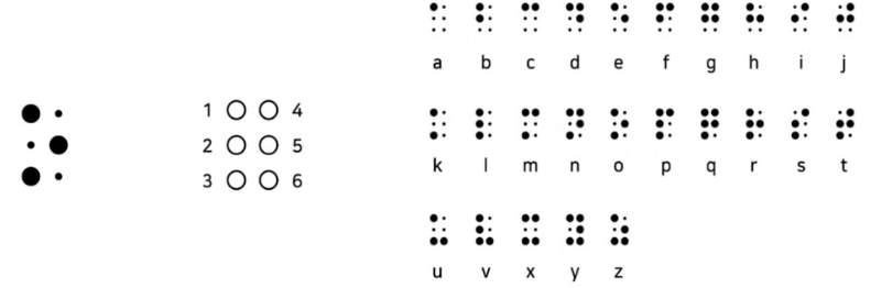 - 점자는 크고(1) 작은(0) 원을 사용해서 모든 알파벳을 표현한다.