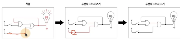 - 두 번째 스위치를 끄면 불이 꺼지는데, 스위치를 켜도 불은 꺼진채로 지속됨