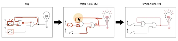 - 첫 번째 스위치를 키면 불이 켜지는데, 스위치를 끄면 불이 켜진채로 지속됨