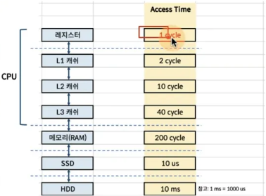- 레지스터는 CPU가 요청을 처리하는데 필요한 데이터를 일시적으로 저장하는 기억장치