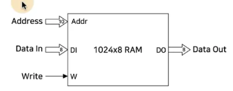 - Address 10개: 2의 10승 -> 1024, DI 8개: 1 byte(8 bits), 1024 x 8 bits = 8196 bits를 다루는 RAM array