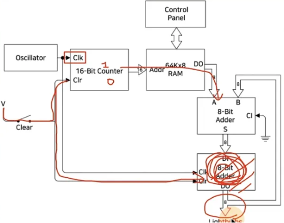 - Store: 8-bit latch의 Output을 바로 64K x 8 RAM에 저장(Write 스위치를 1로 만듬)