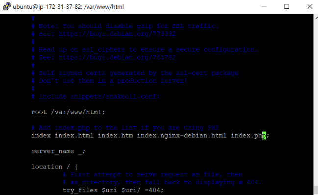 -> php와 nginx연동 필요: 터미널에서 sudo vi /etc/nginx/sites-available/default로 파일을 열어서,
