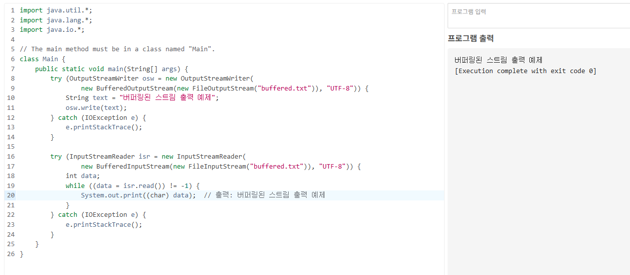1. 보조 스트림 (Filter Streams)기본 스트림을 감싸서 기능을 확장하는 역할입력 스트림: BufferedInputStream, DataInputStream출력 스트림: BufferedOutputStream, DataOutputStream, PrintStream단독 사용 불가 → 반드시 기본 스트림을 감싸야 함1) BufferedInputStream / BufferedOutputStream 기본 스트림(InputStream/OutputStream)을 감싸서 버퍼(buffer) 메모리를 활용하여 입출력 효율을 높이는 보조 스트림데이터가 1바이트씩 처리되는 기본 스트림의 단점(느림)을 보완하기 위해 한 번에 블록 단위로 처리-> 디스크 I/O 최소화 → 성능 향상BufferedInputStream..